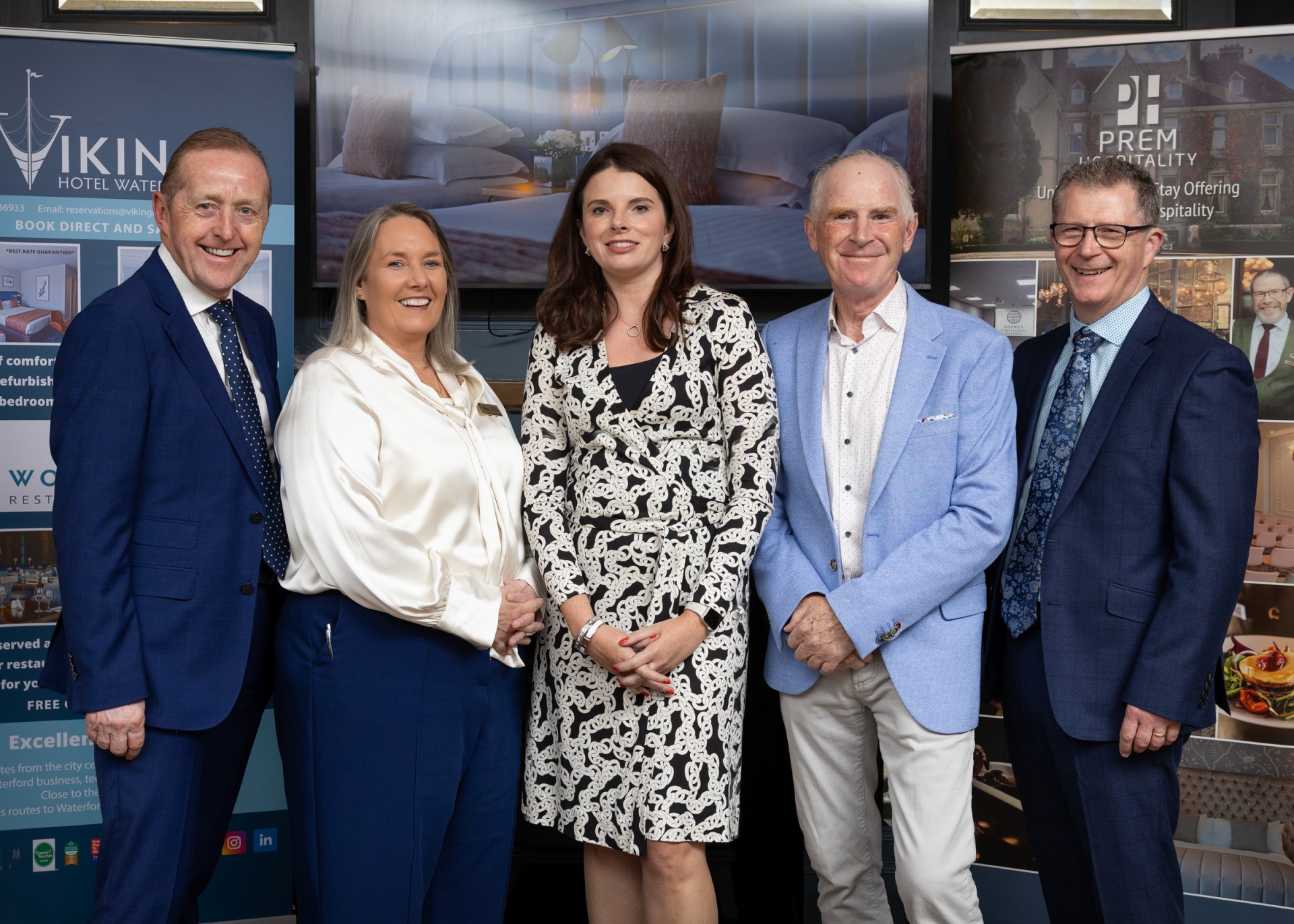 PHOTO: Jim Murphy, CEO, Prem Group, Karen Dollery, General Manager, Viking Hotel Waterford, Noeleen & Noel Kelly, Owners, Viking Hotel Waterford, and Paul Dempsey, COO, Prem Group. Photo: Garrett FitzGerald Photography