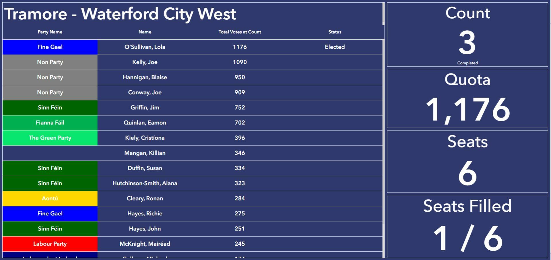 There are 6 seats being contested in the Tramore / Waterford City West Electoral Area with just one filled after three counts. That seat has gone to Fine Gael's Lola O'Sullivan.