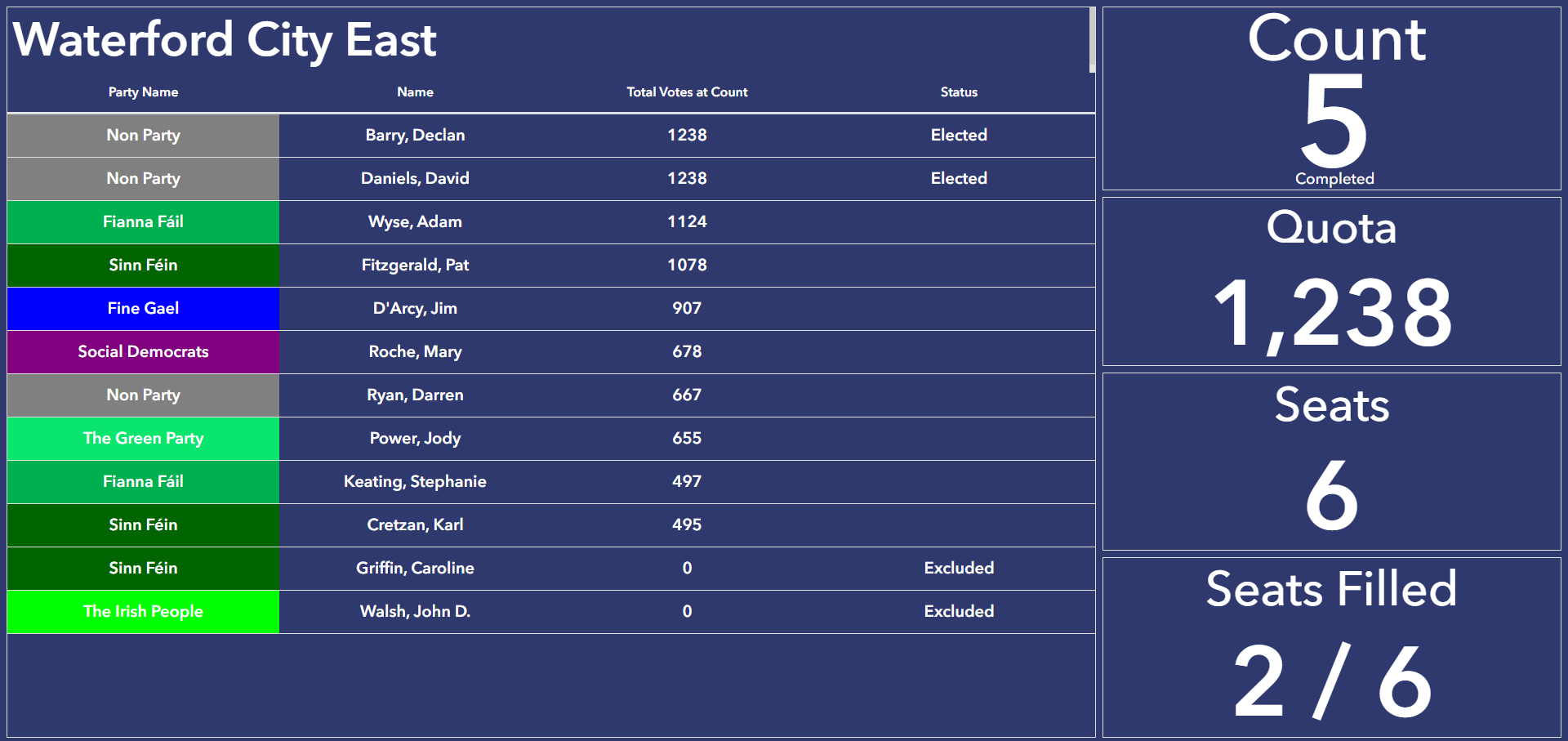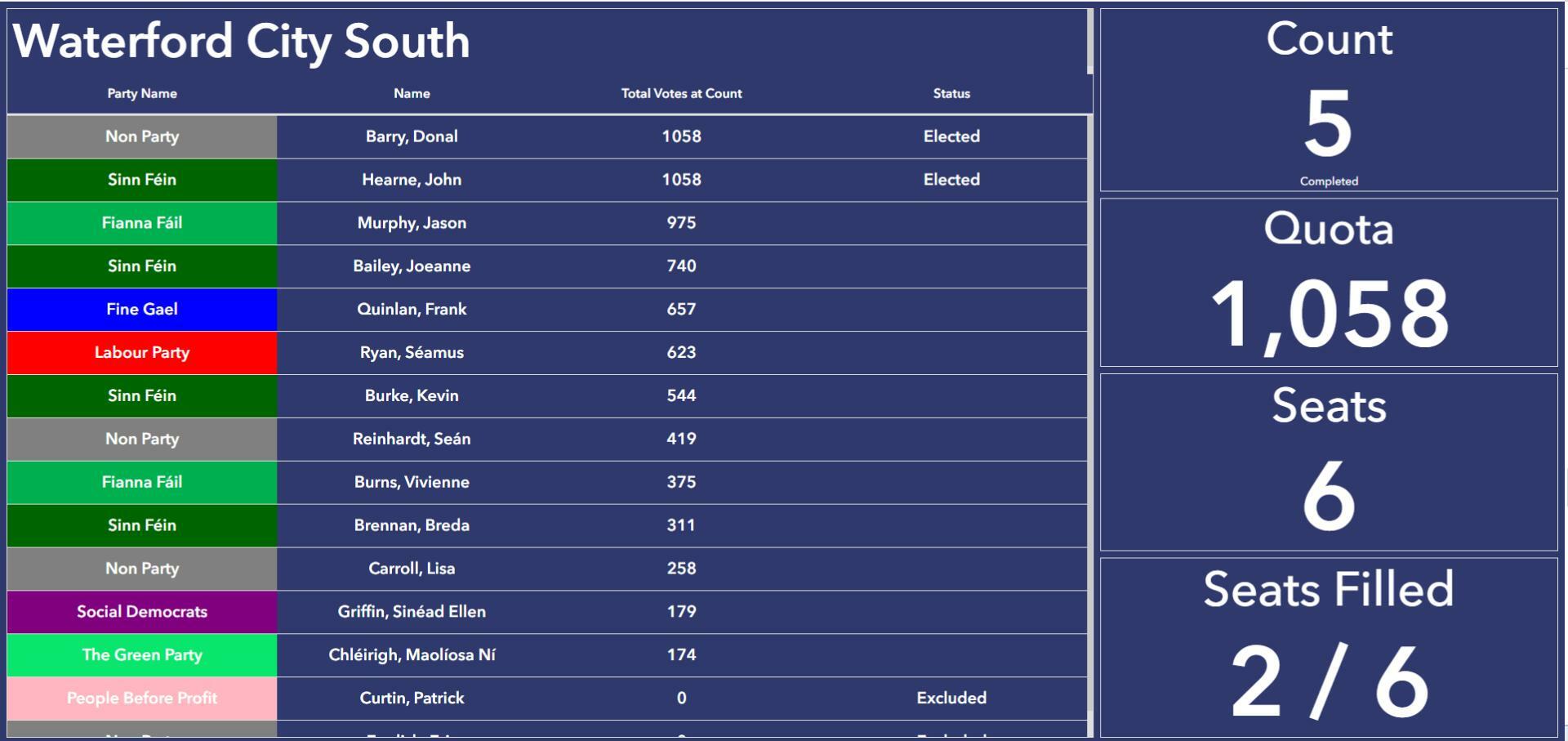 There are also six seats being contested in the Waterford City East Electoral Area with two already filled by Declan Barry (Ind) and David Daniels (Ind), both of whom have reached the quota.