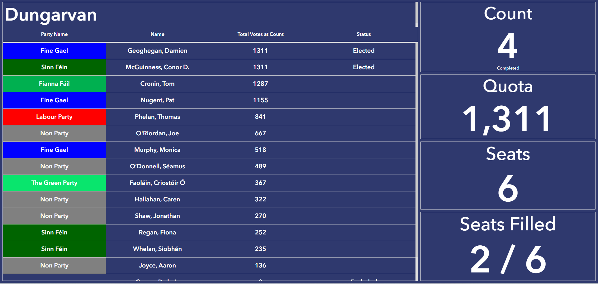 Damien Geoghegan (FG) and Conor McGuinness (SF) have taken the first two seats in Dungarvan with four others still in play. Tom Cronin (FF) on 1,287 cotes after four counts is very close to the quota of 1,311 and will be elected.
