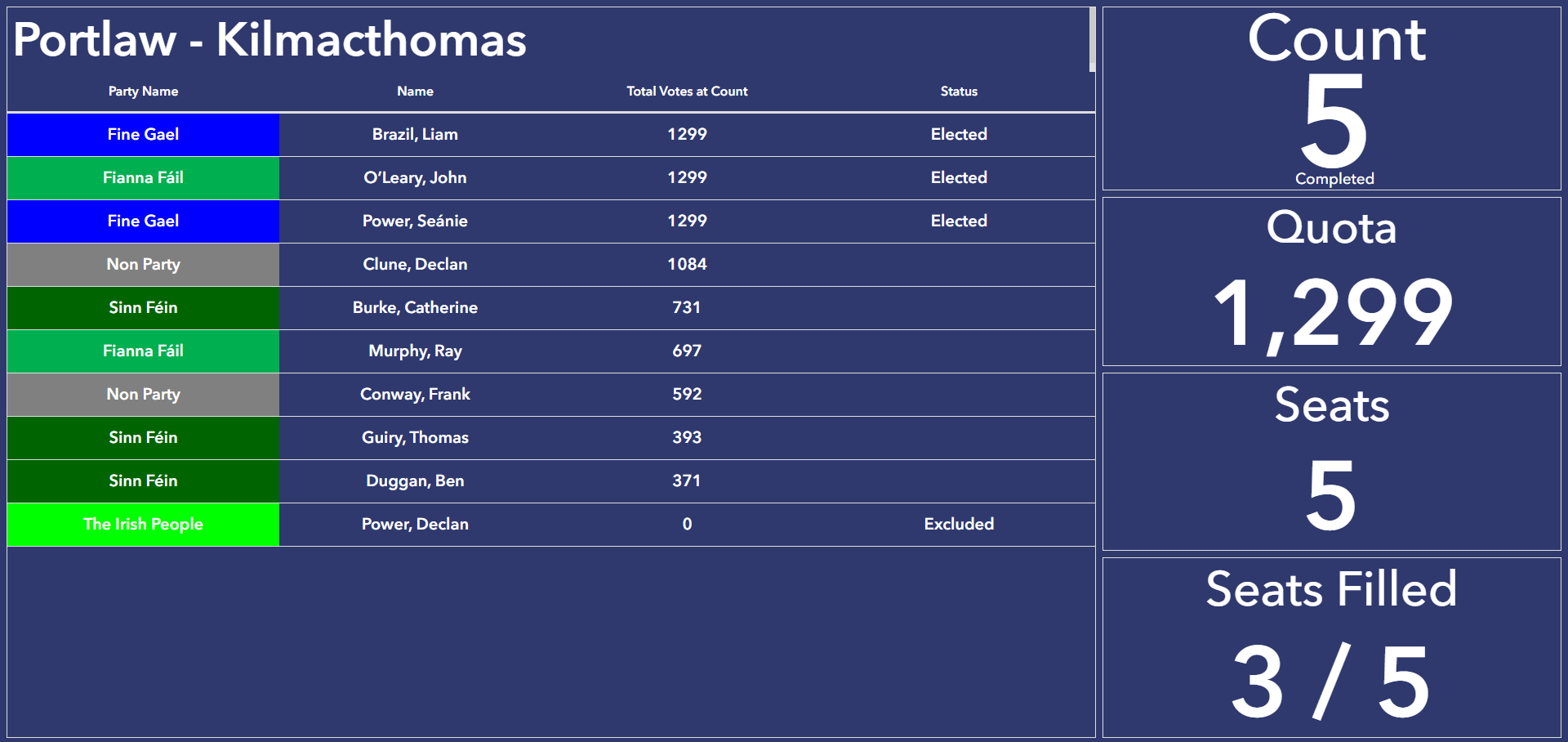 Three of the five seats are filled in Portlaw-Kilmacthomas. John O’Leary (FF), Seanie Power (FG) and Liam Brazil (FG) have all got over the line, leaving two seats up for grabs.
