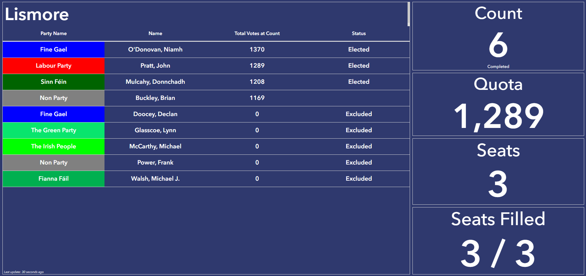 All three seats have been filled in Lismore after John Pratt (Lab), Niamh O'Donovan (FG) and Donnchadh Mulcahy (SF) all got over the line. Brian Buckley (Ind) missed out by 39 votes on the last count to Mulcahy.