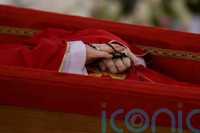 The first images of his body, released on Tuesday, showed him lying in a wooden casket, dressed in red religious garments with rosary prayer beads draped across his hands.