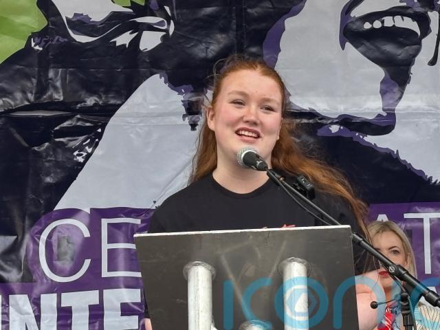 She condemned the “epidemic of violence against women and girls” in Northern Ireland, Ireland and across the globe, and spending on wars at the same time as cuts on spending in international aid.