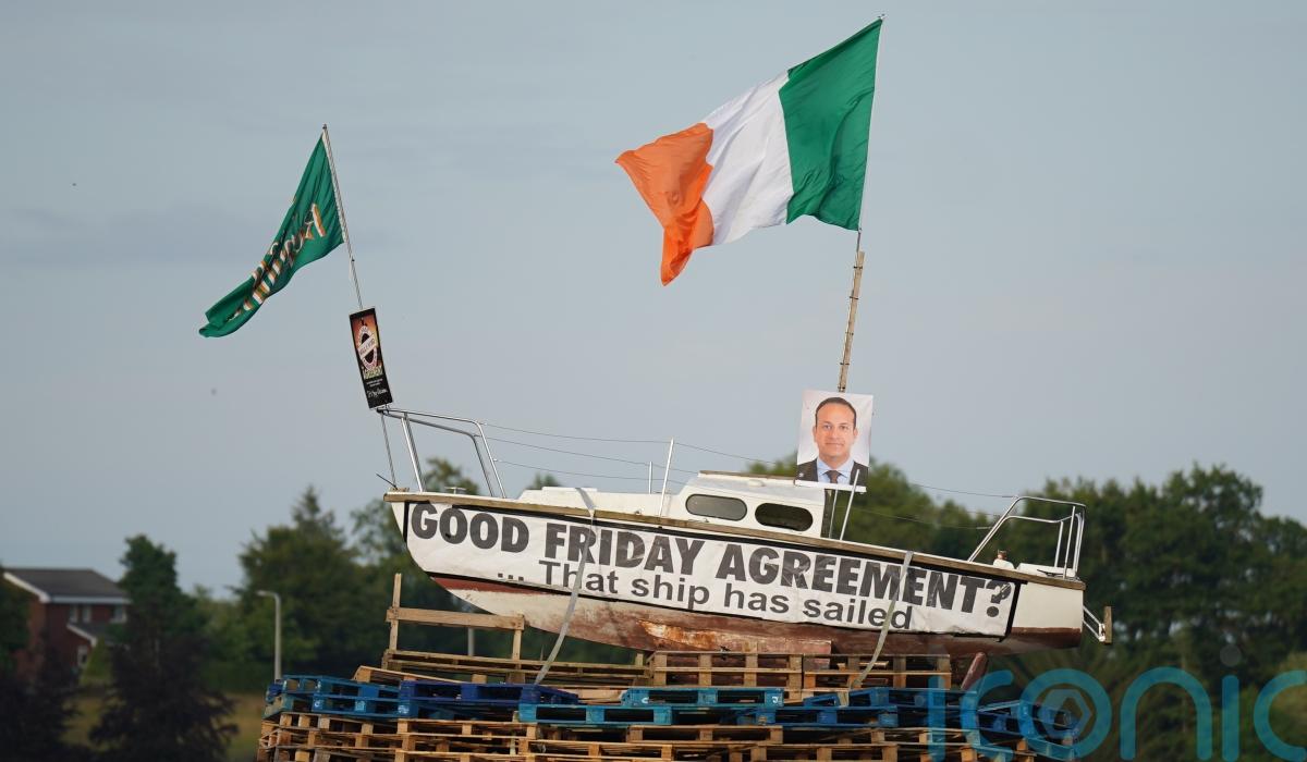 On the side of the boat on the bonfire, a banner reading “Good Friday Agreement? That ship has sailed” was attached, with a mock copy of the 1998 accord across which the words “null and void” were printed.