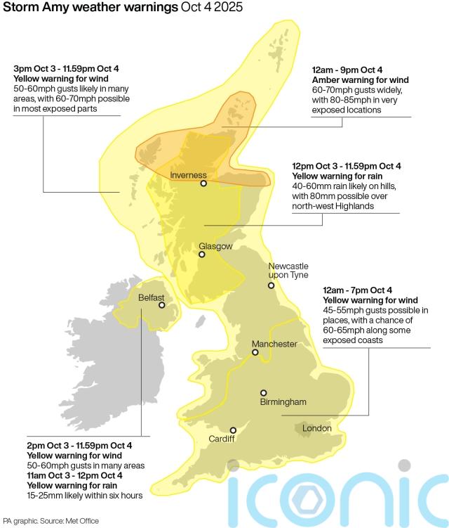 The Met Office said Storm Amy will likely bring a period of damaging south to south-westerly winds during the late afternoon and evening hours on Friday, with gusts of 60-70mph (97-113km/h) inland and up to 80mph along some more exposed coasts.