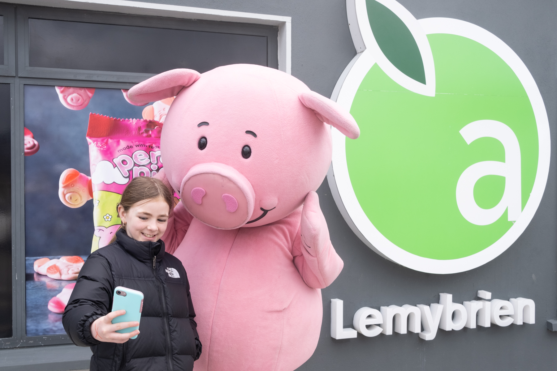 Percy Pig pictured with Helene Farrell from Abbeyside pictured at the launch of Applegreen Lemybrien with M&S Food.